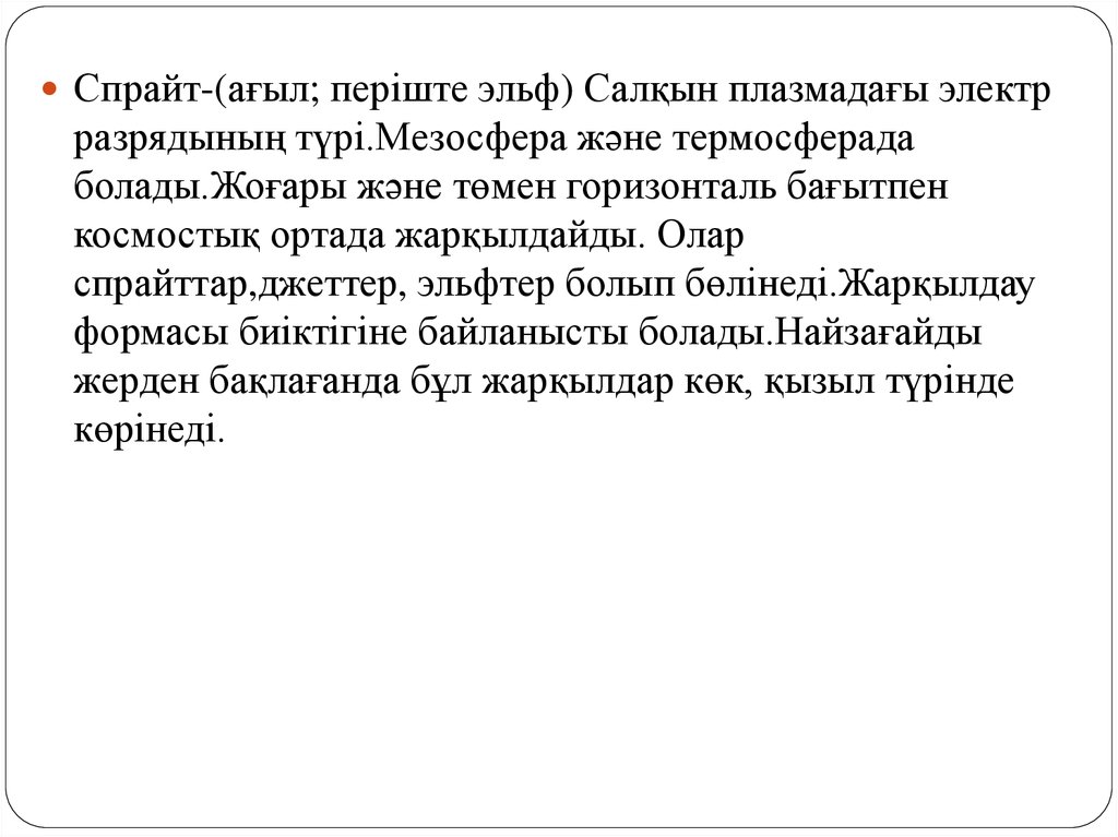Спрайт-(ағыл; періште эльф) Салқын плазмадағы электрразрядының түрі.Мезосфера және термосферада