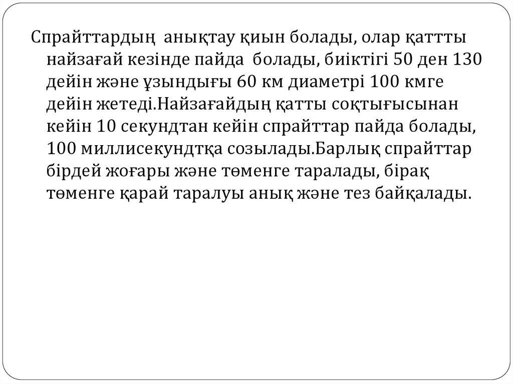 Спрайттардың анықтау қиын болады, олар қатттынайзағай кезінде пайда болады, биіктігі 50 ден 130