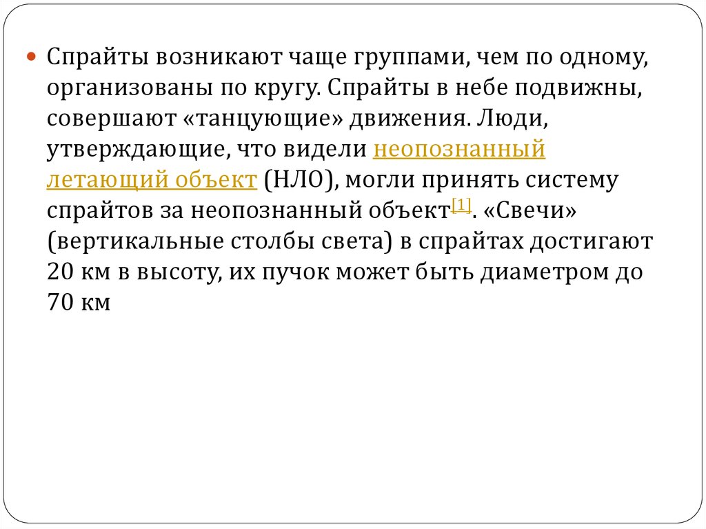 Спрайты возникают чаще группами, чем по одному,организованы по кругу. Спрайты в небе подвижны,