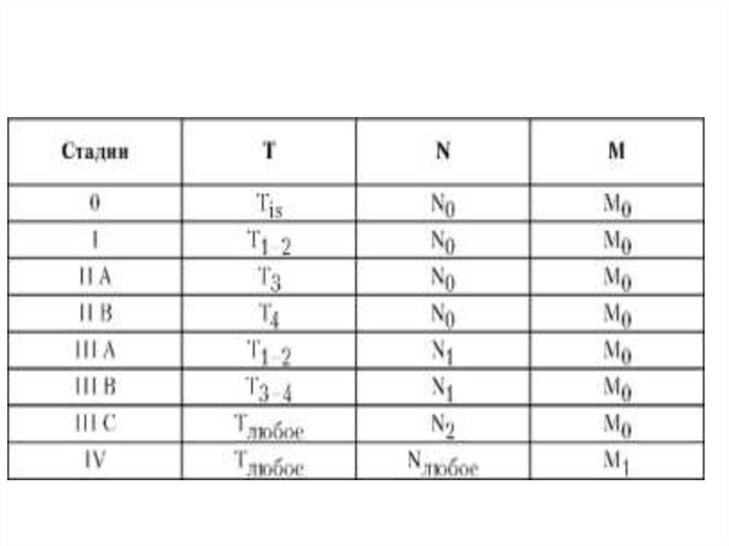 • Т (tumor): Т0, T1, Т2, Т3, Т4;• N (Nodulus): N0, N1, N2, N3;
