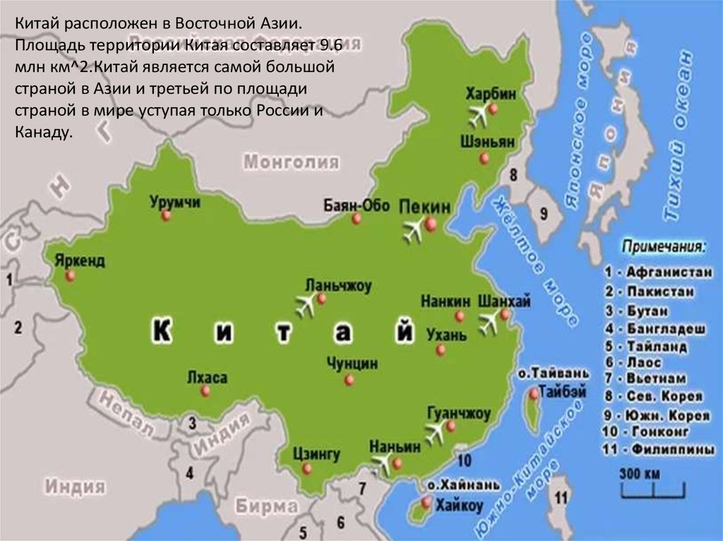 Китай расположен в Восточной Азии.Площадь территории Китая составляет 9.6