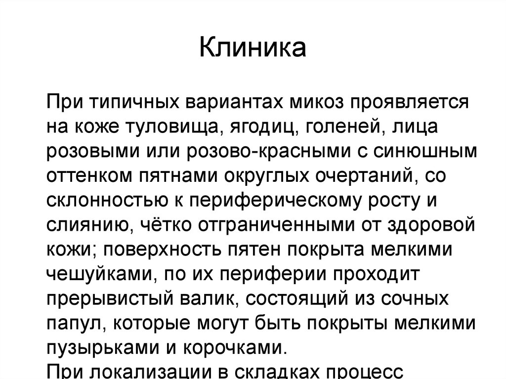 КлиникаПри типичных вариантах микоз проявляется