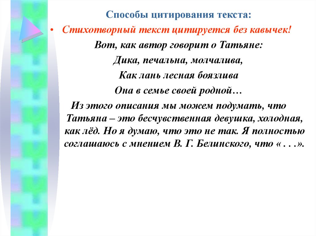Способы цитирования текста:• Стихотворный текст цитируется без кавычек!