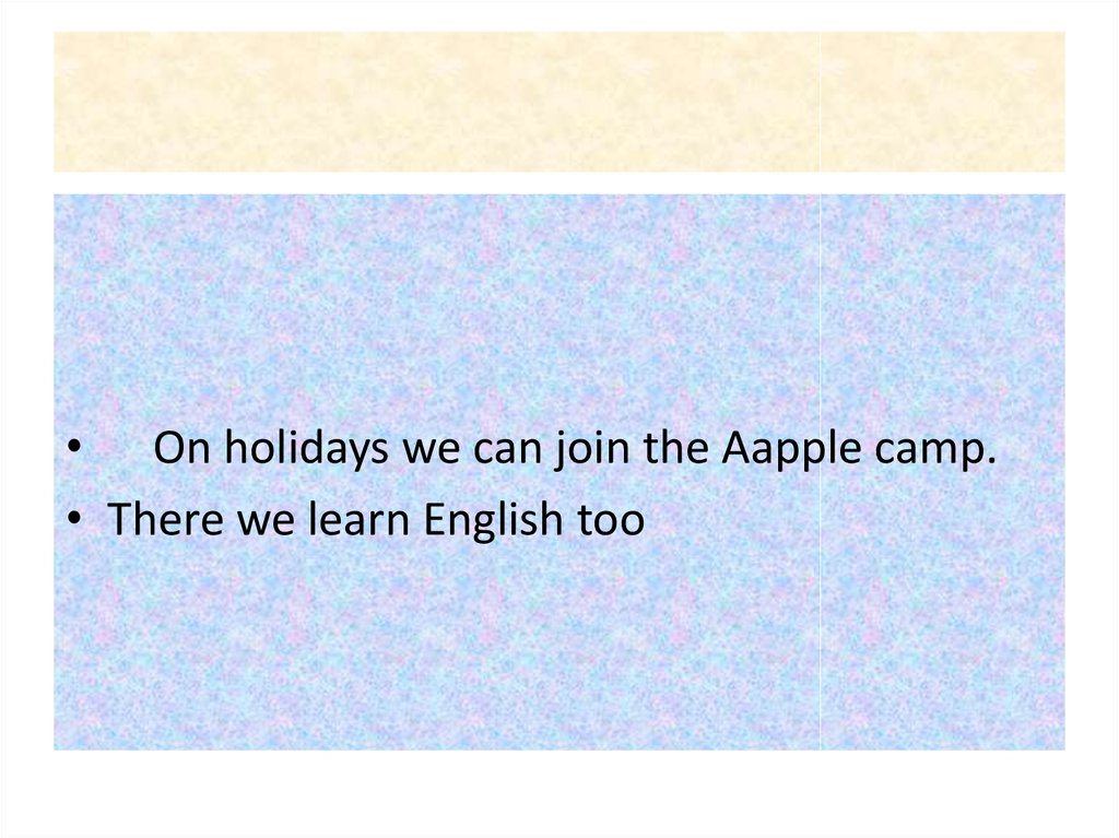 • On holidays we can join the Aapple camp.• There we learn English too