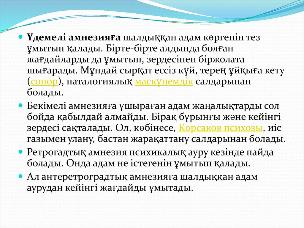 1.Ретроградтық амнезия - пациент амнезияныңбасталуынан бұрын болған оқиғаларды есінде