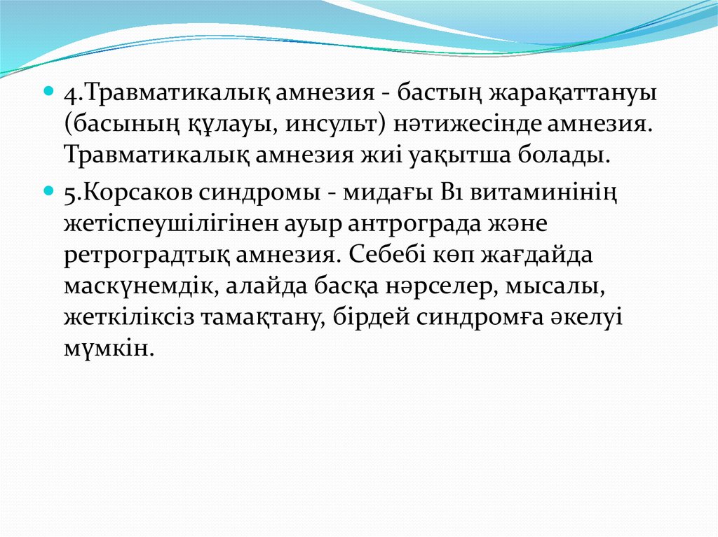 4.Травматикалық амнезия - бастың жарақаттануы(басының құлауы, инсульт) нәтижесінде амнезия.