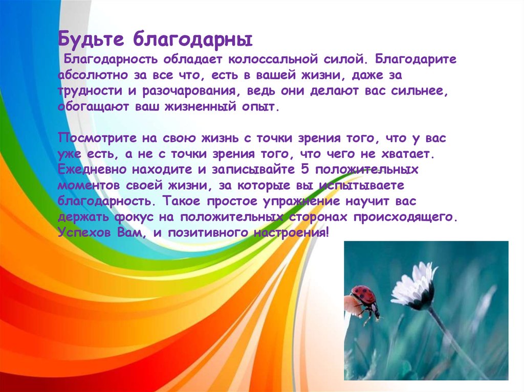 Будьте благодарныБлагодарность обладает колоссальной силой. Благодарите