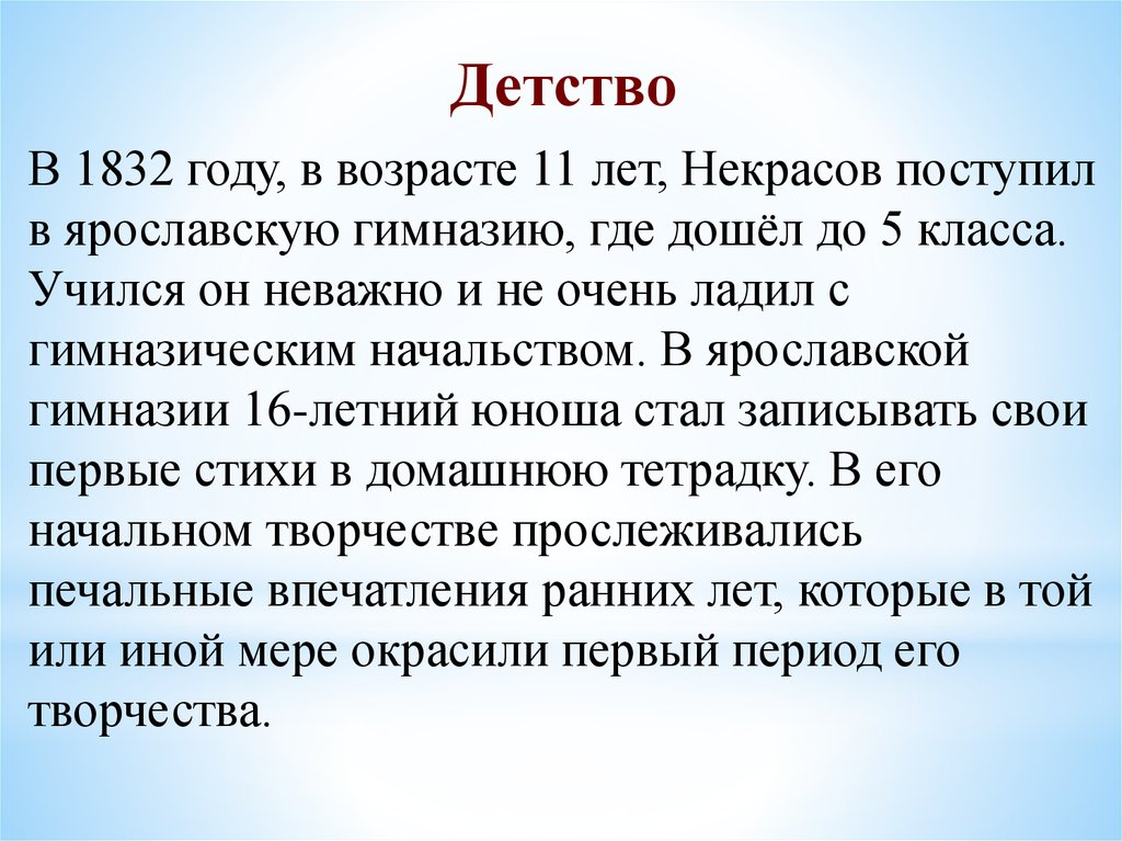 ДетствоВ 1832 году, в возрасте 11 лет, Некрасов поступил