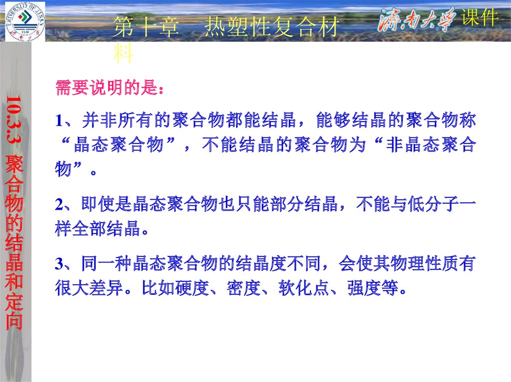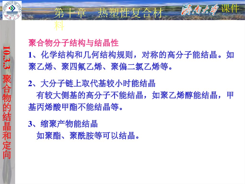 1、化学结构和几何结构规则 对称的高分子能结晶。如