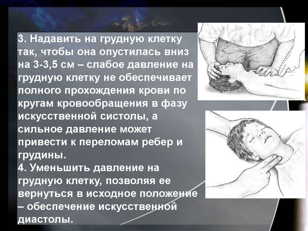 3. Надавить на грудную клеткутак, чтобы она опустилась вниз