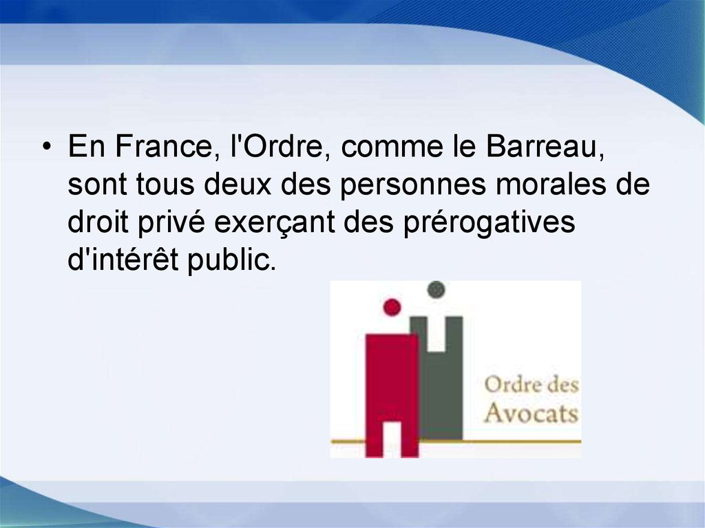 • En France, l'Ordre, comme le Barreau,sont tous deux des personnes morales de