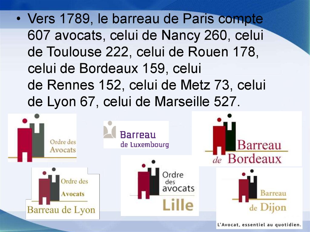 • Vers 1789, le barreau de Paris compte607 avocats, celui de Nancy 260, celui