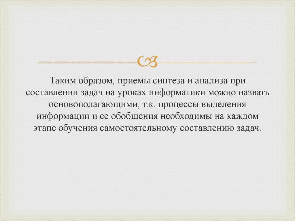 Таким образом, приемы синтеза и анализа присоставлении задач на уроках информатики можно назвать