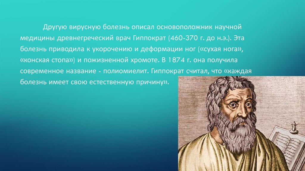 Другую вирусную болезнь описал основоположник научноймедицины древнегреческий врач Гиппократ (460-370 г. до н.э.). Эта