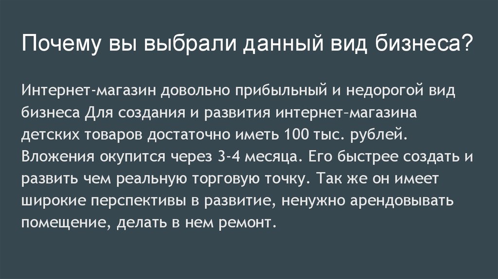 Почему вы выбрали данный вид бизнеса?Интернет-магазин довольно прибыльный и недорогой вид