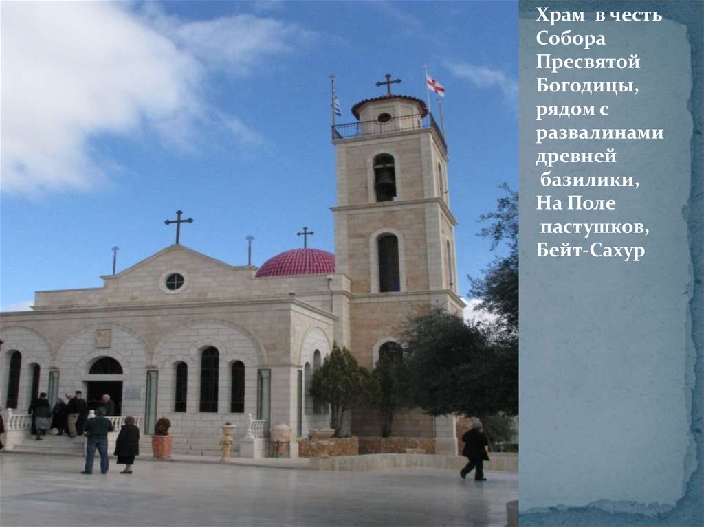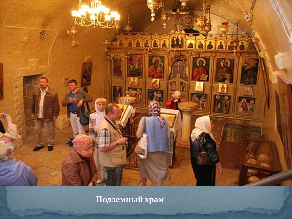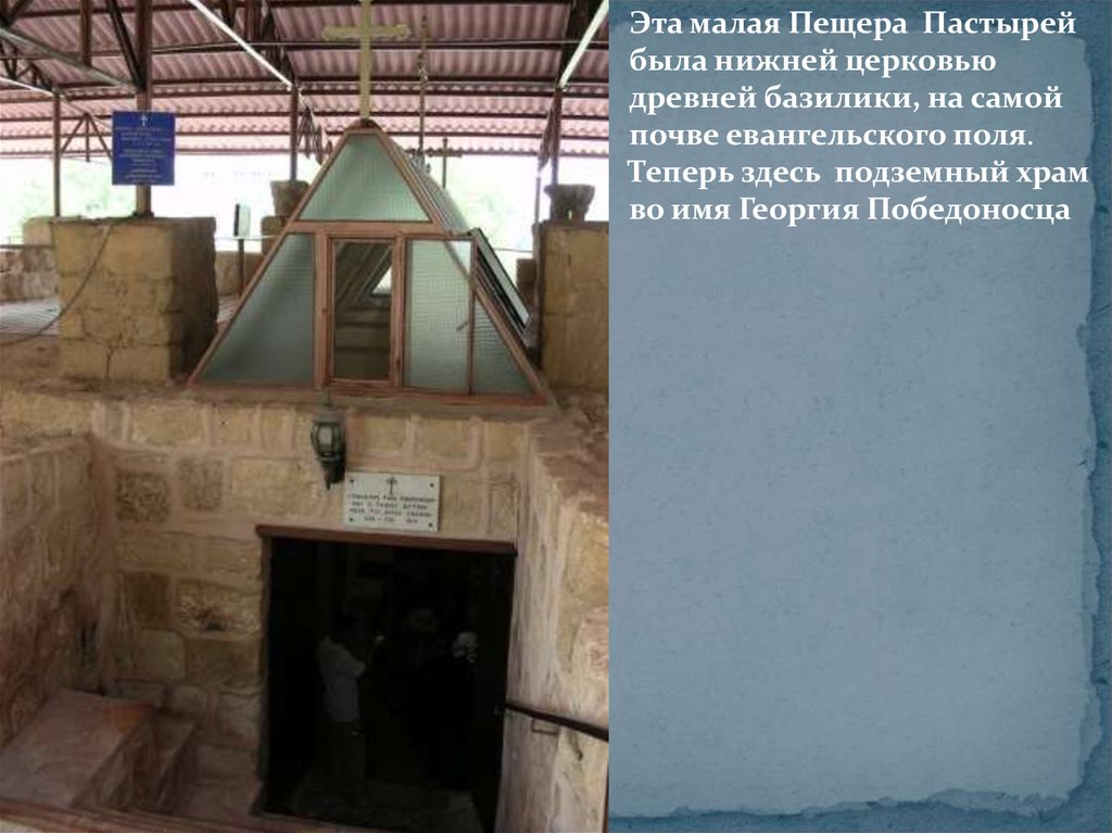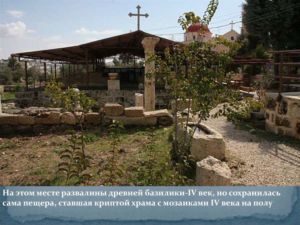 На этом месте развалины древней базилики-IV век, но сохраниласьсама пещера, ставшая криптой храма с мозаиками IV века на полу