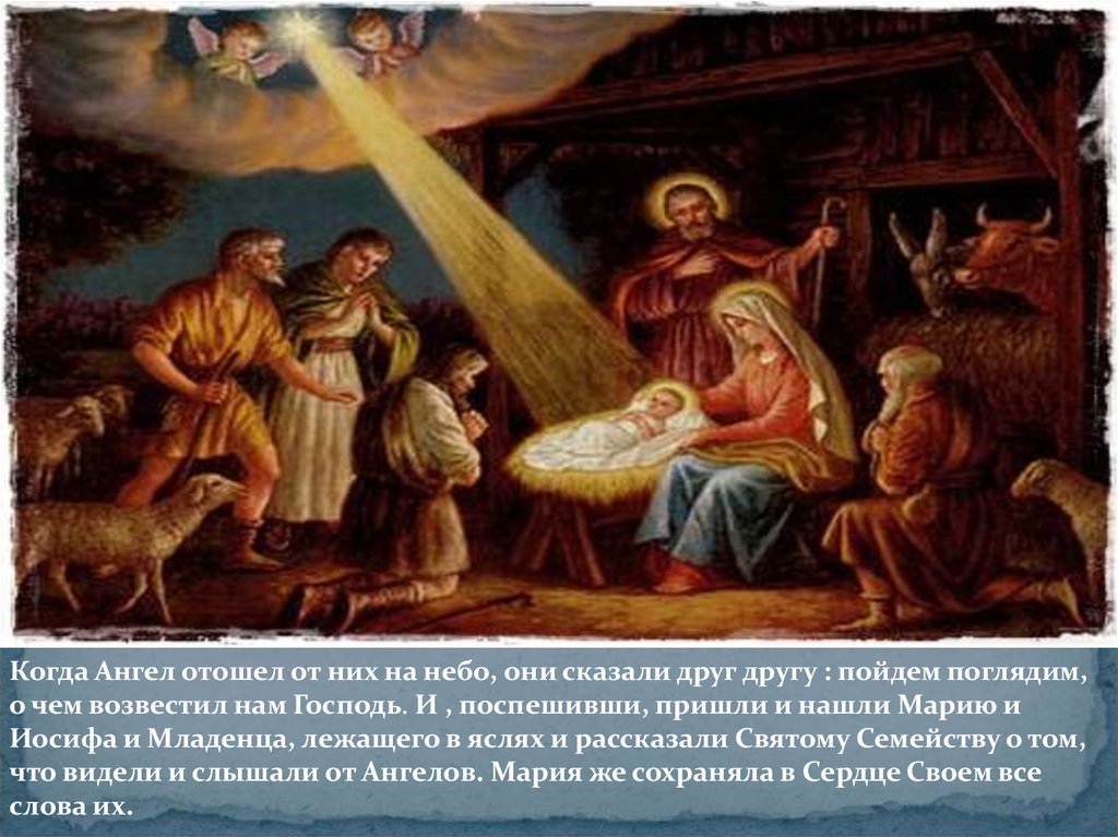 Когда Ангел отошел от них на небо, они сказали друг другу : пойдем поглядим,о чем возвестил нам Господь. И , поспешивши, пришли и нашли Марию и