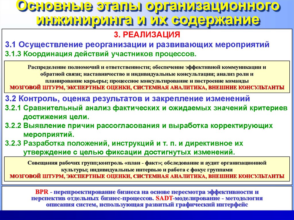 Совещания рабочих групп;контроль «план - факт»; обследование и аудит организационной