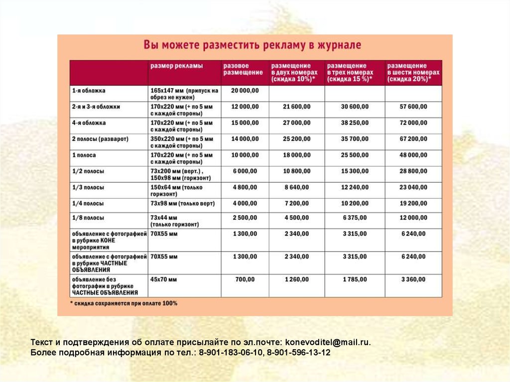 Текст и подтверждения об оплате присылайте по эл.почте: konevoditel@mail.ru.Более подробная информация по тел.: 8-901-183-06-10, 8-901-596-13-12