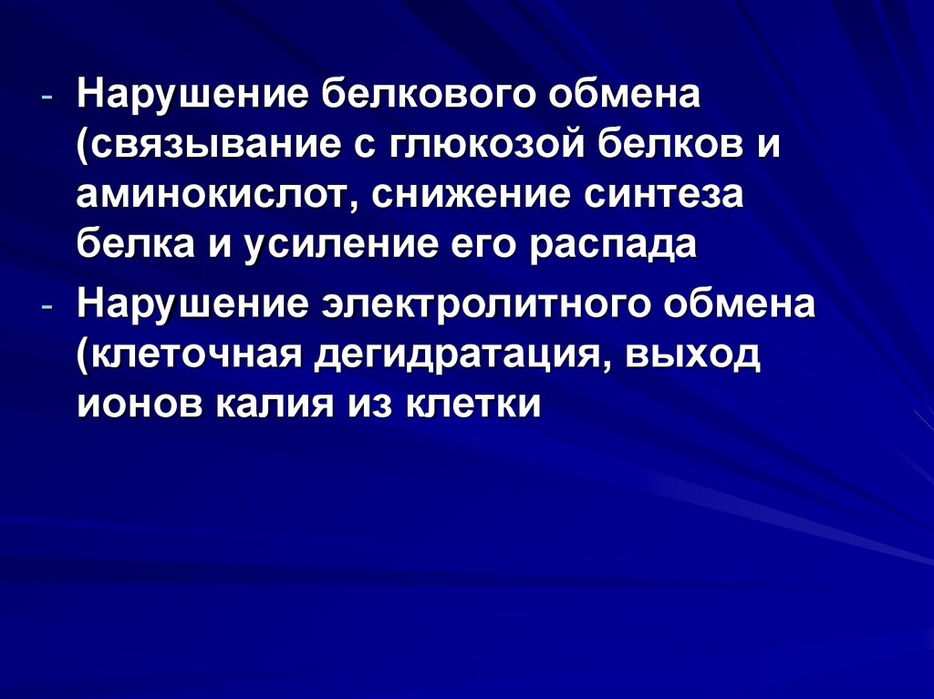 - Нарушение белкового обмена(связывание с глюкозой белков и
