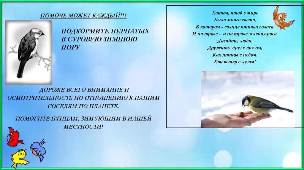 ПОМОГИТЕ ПТИЦАМ, ЗИМУЮЩИМ В НАШЕЙ