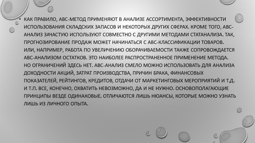 • КАК ПРАВИЛО, АВС-МЕТОД ПРИМЕНЯЮТ В АНАЛИЗЕ АССОРТИМЕНТА, ЭФФЕКТИВНОСТИИСПОЛЬЗОВАНИЯ СКЛАДСКИХ ЗАПАСОВ И НЕКОТОРЫХ ДРУГИХ СФЕРАХ. КРОМЕ ТОГО, АВСАНАЛИЗ ЗАЧАСТУЮ ИСПОЛЬЗУЮТ СОВМЕСТНО С ДРУГИМИ МЕТОДАМИ СТАТАНАЛИЗА. ТАК,
