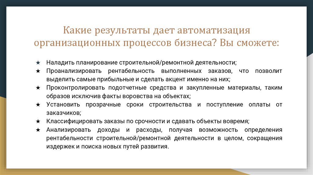 Какие результаты дает автоматизацияорганизационных процессов бизнеса? Вы сможете: