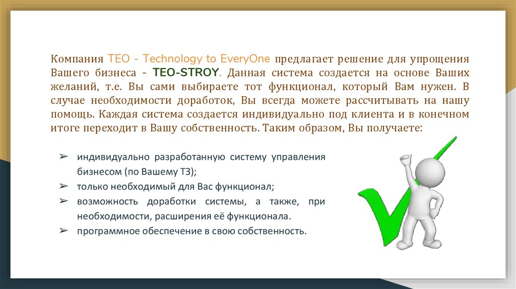 Компания TEO - Technology to EveryOne предлагает решение для упрощенияВашего бизнеса - TEO-STROY. Данная система создается на основе Ваших