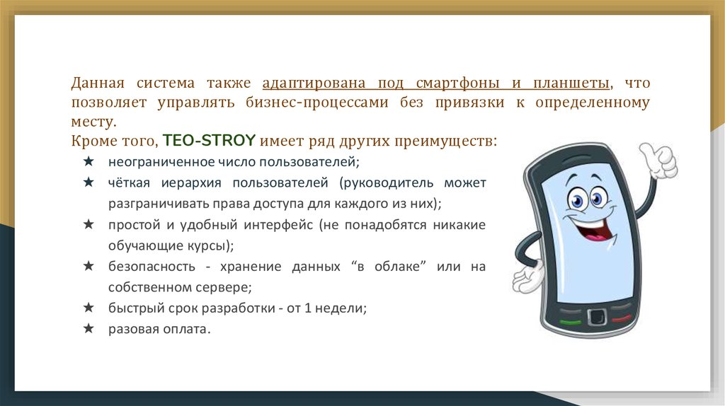 Данная система также адаптирована под смартфоны и планшеты, чтопозволяет управлять бизнес-процессами без привязки к определенному