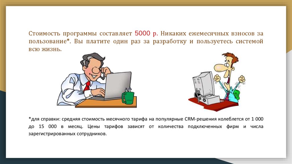 Стоимость программы составляет 5000 р. Никаких ежемесячных взносов запользование*. Вы платите один раз за разработку и пользуетесь системой