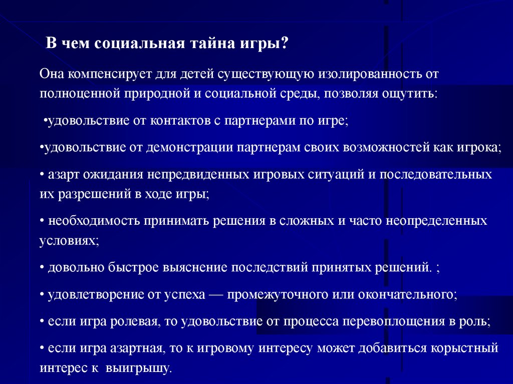 В чем социальная тайна игры?Она компенсирует для детей существующую изолированность от