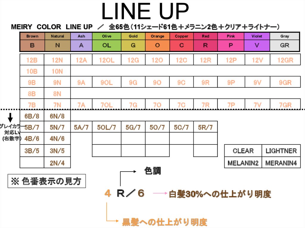 LINE UPMEIRY COLOR LINE UP 全65色 11シェード61色 メラニン2色 クリア ライトナー