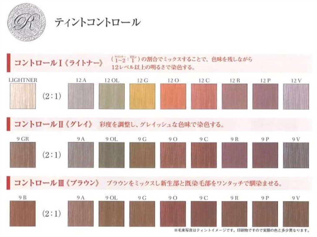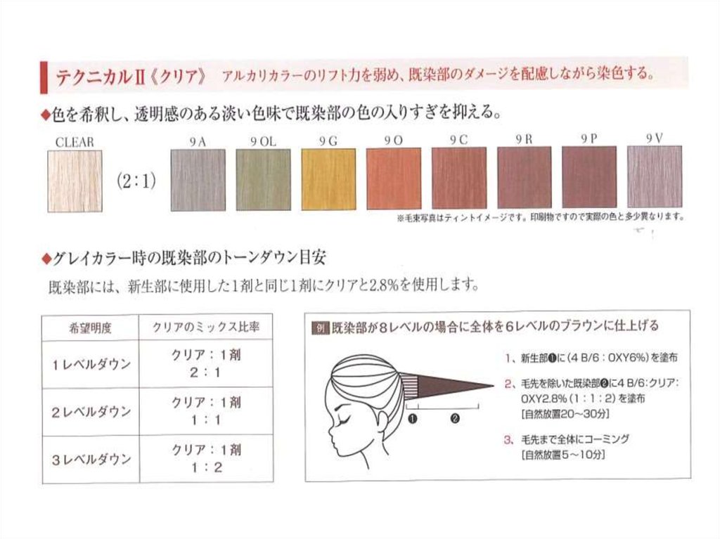 クリアをミックスすることでアルカリカラーのリフト力を弱め、ペール系の色調で仕上げるこ