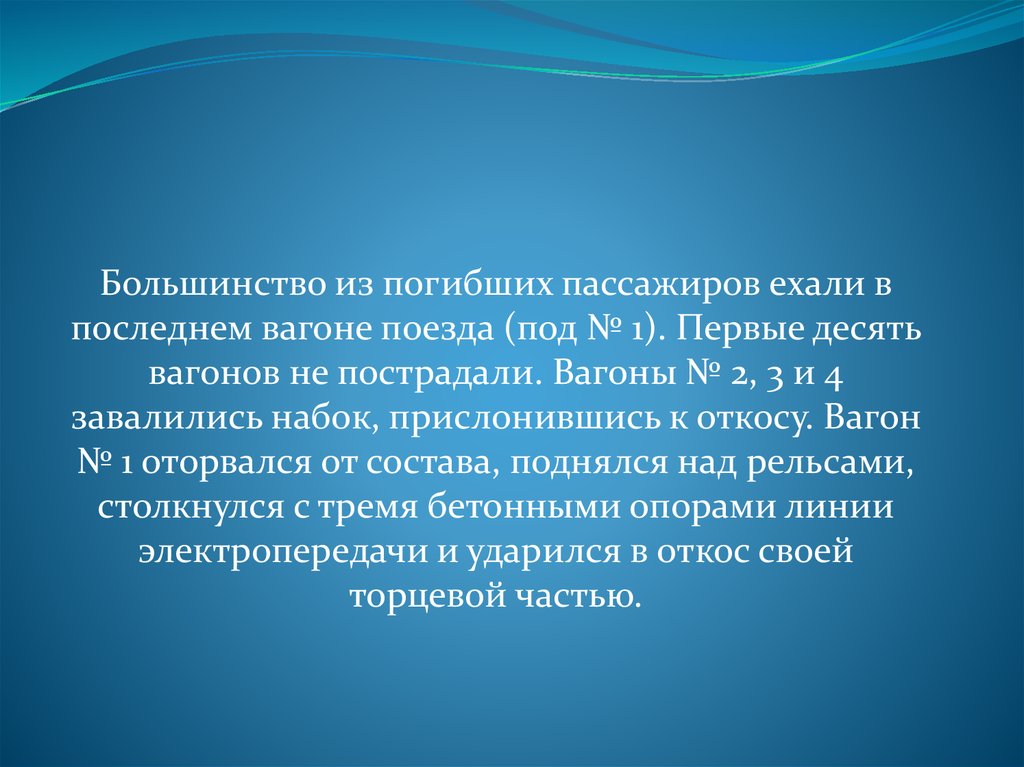 Большинство из погибших пассажиров ехали впоследнем вагоне поезда (под № 1). Первые десять