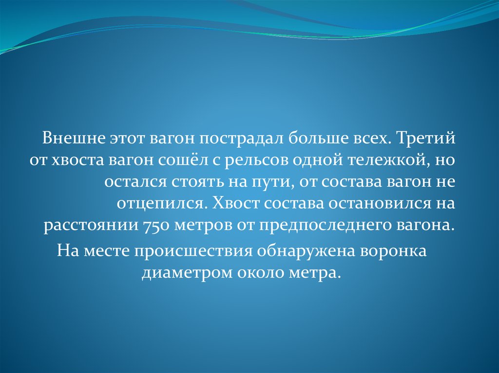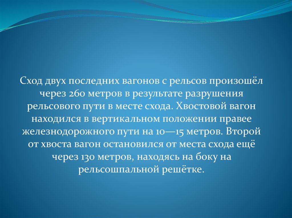 Сход двух последних вагонов с рельсов произошёлчерез 260 метров в результате разрушения