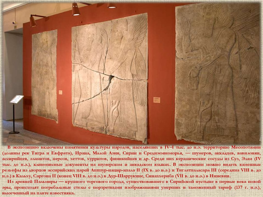 В экспозицию включены памятники культуры народов, населявших в IV–I тыс. до н.э. территорию Месопотамии(долины рек Тигра и Евфрата), Ирана, Малой Азии, Сирии и Средиземноморья, — шумеров, аккадцев, вавилонян,