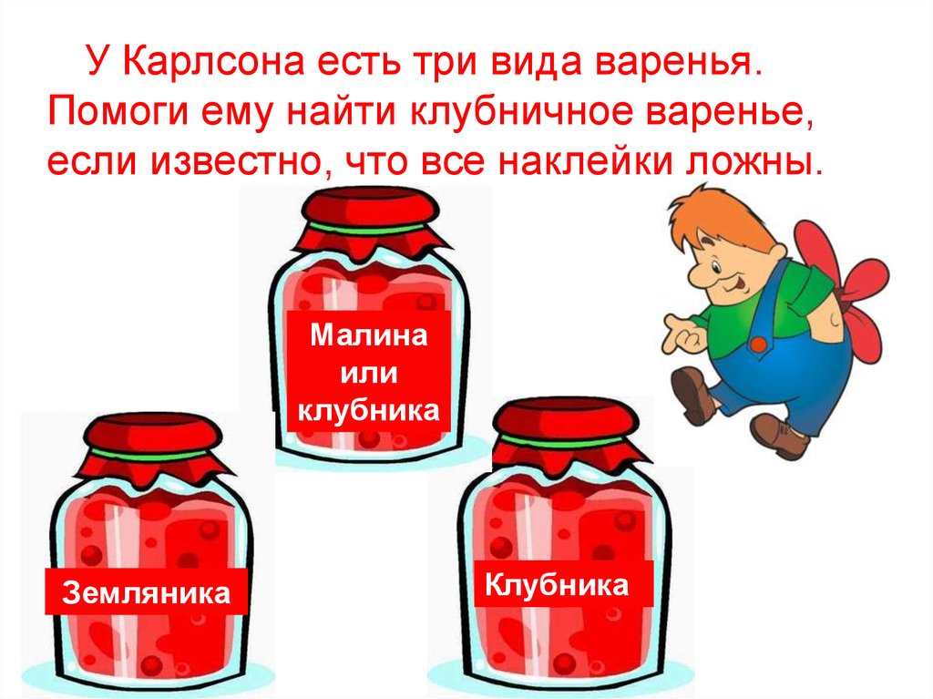 У Карлсона есть три вида варенья.Помоги ему найти клубничное варенье,
