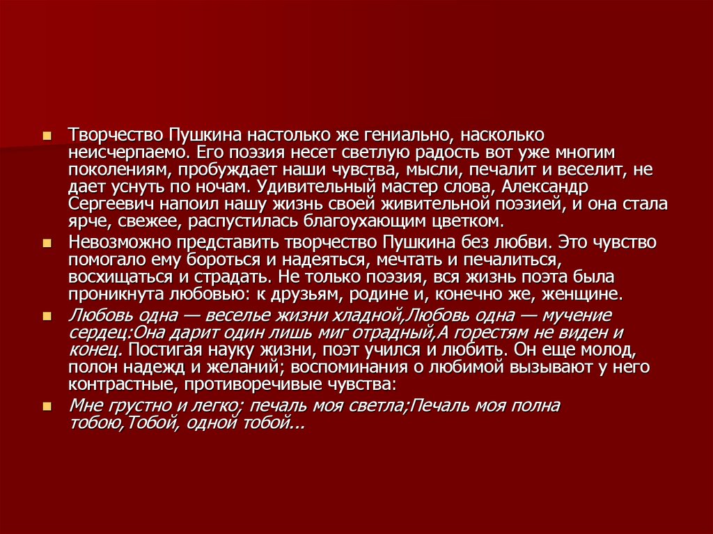Невозможно представить творчество Пушкина без любви. Это чувство