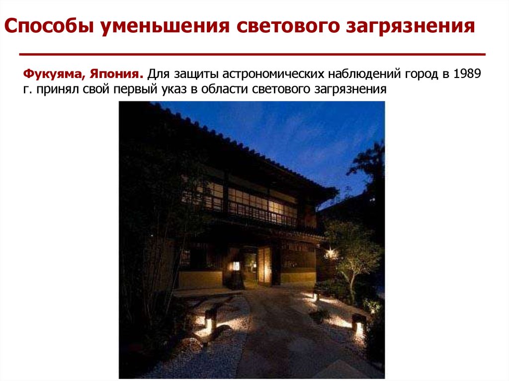 Способы уменьшения светового загрязненияФукуяма, Япония. Для защиты астрономических наблюдений город в 1989