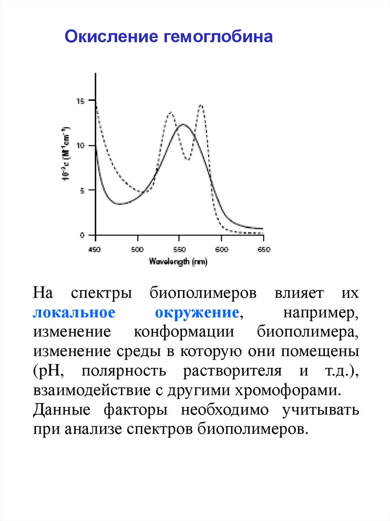 Окисление гемоглобинаНа спектры биополимеров влияет их