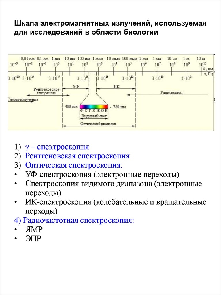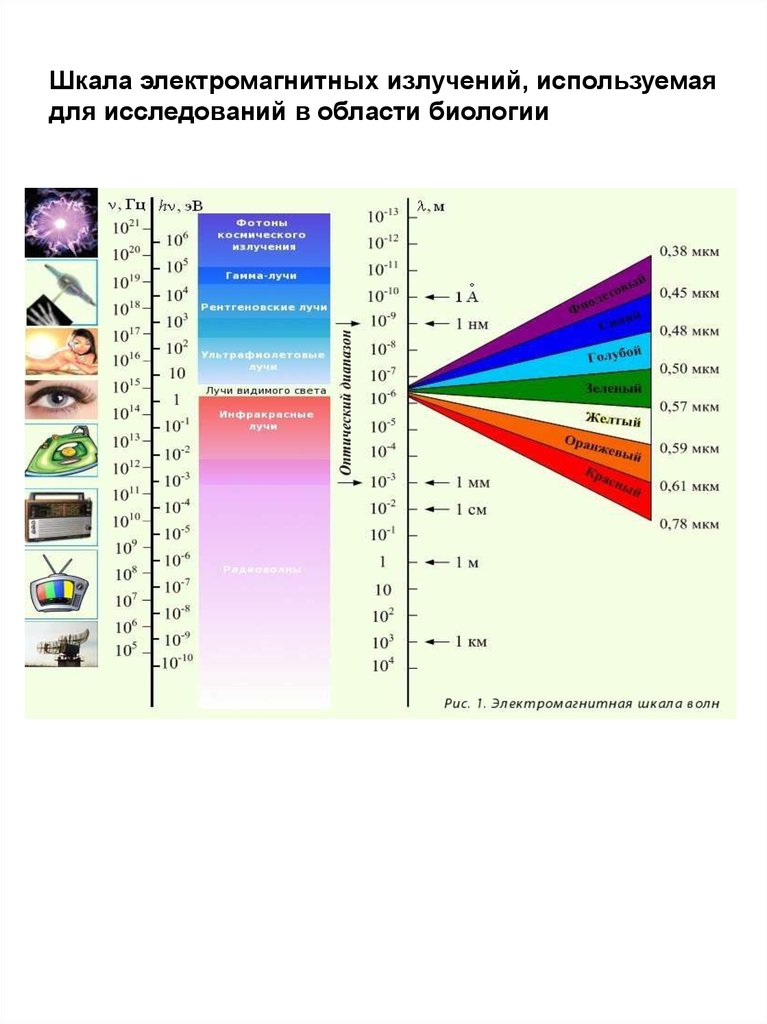 Шкала электромагнитных излучений, используемаядля исследований в области биологии