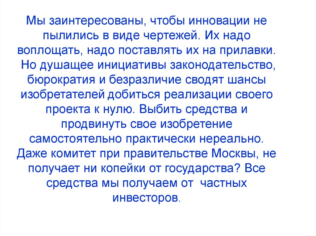 Мы заинтересованы, чтобы инновации непылились в виде чертежей. Их надо