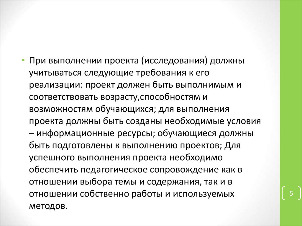 • При выполнении проекта (исследования) должныучитываться следующие требования к его