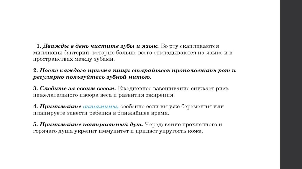 1. Дважды в день чистите зубы и язык. Во рту скапливаютсямиллионы бактерий, которые больше всего откладываются на языке и в