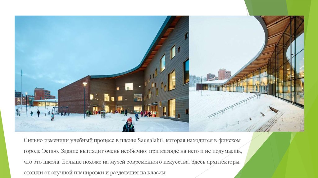 Сильно изменили учебный процесс в школе Saunalahti, которая находится в финскомгороде Эспоо. Здание выглядит очень необычно: при взгляде на него и не подумаешь,
