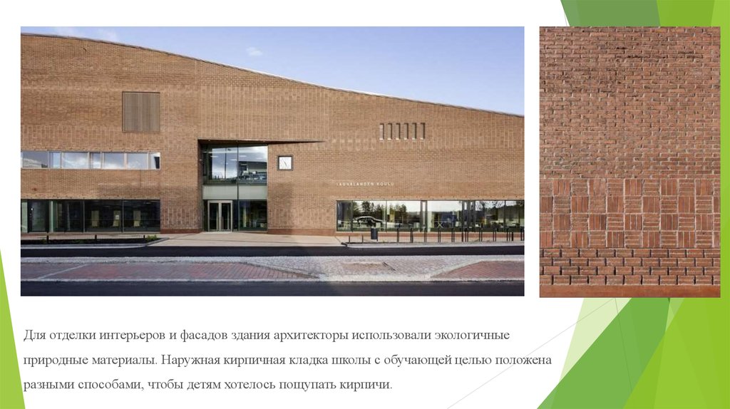 Для отделки интерьеров и фасадов здания архитекторы использовали экологичныеприродные материалы. Наружная кирпичная кладка школы с обучающей целью положена