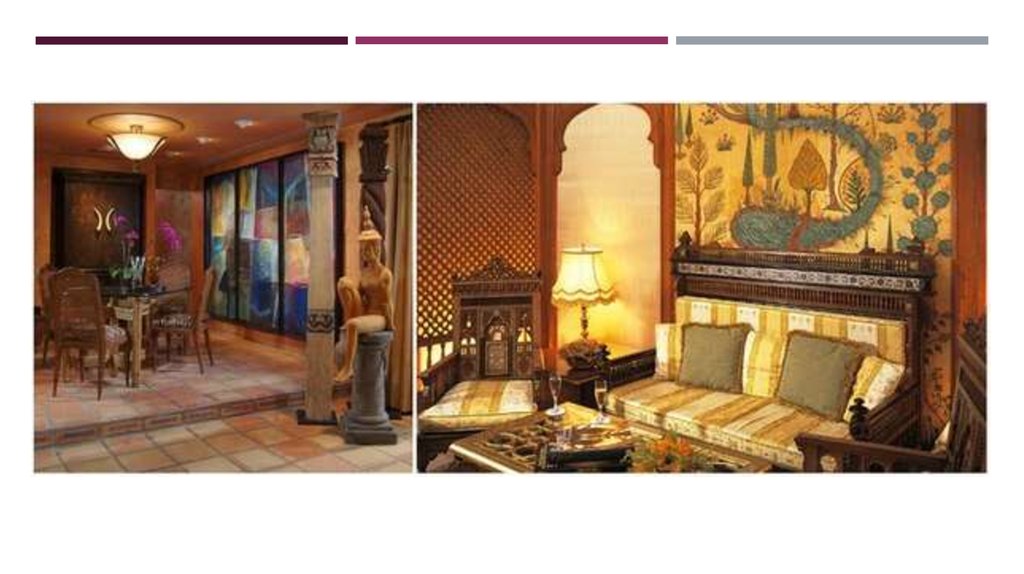 Декор: большие напольные керамические вазы, картины, статуэтки, бюсты богов, пирамиды