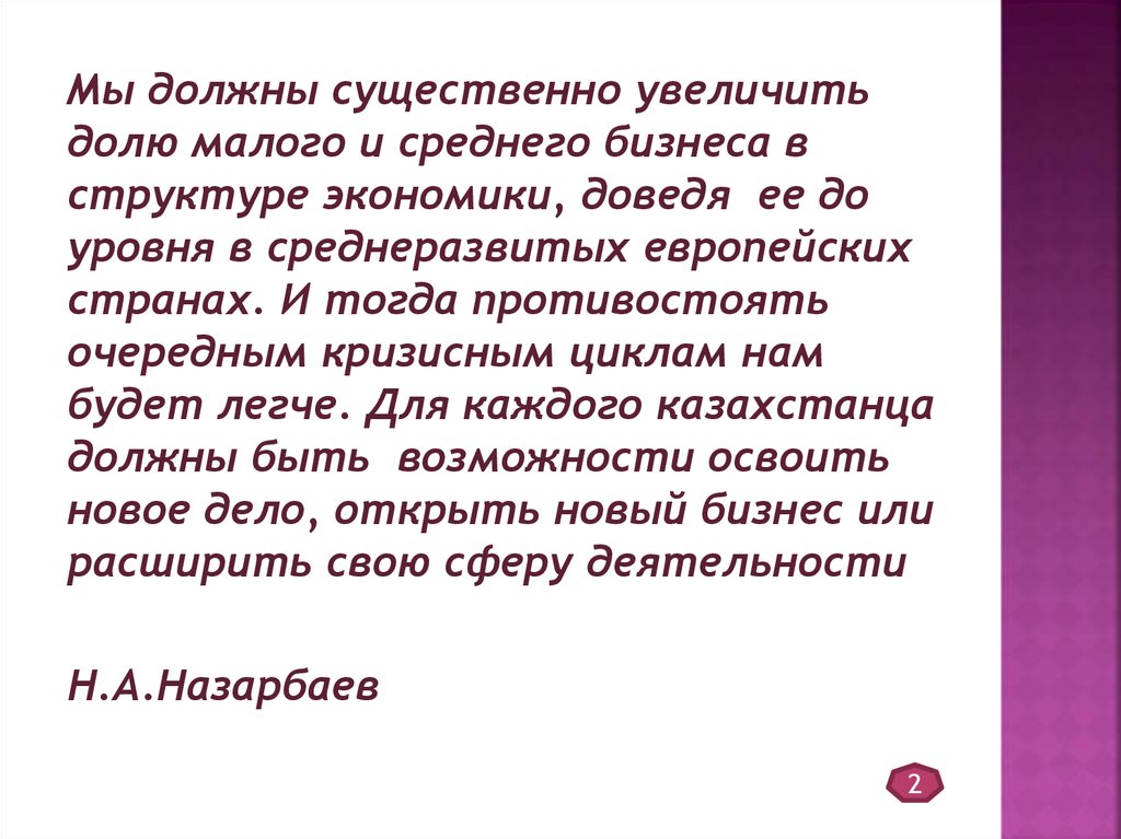 Государственная политика в области развитиямалого и среднего бизнеса в РК является частью