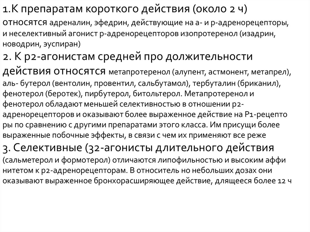 1.К препаратам короткого действия (около 2 ч)относятся адреналин, эфедрин, действующие на а- и p-адренорецепторы,