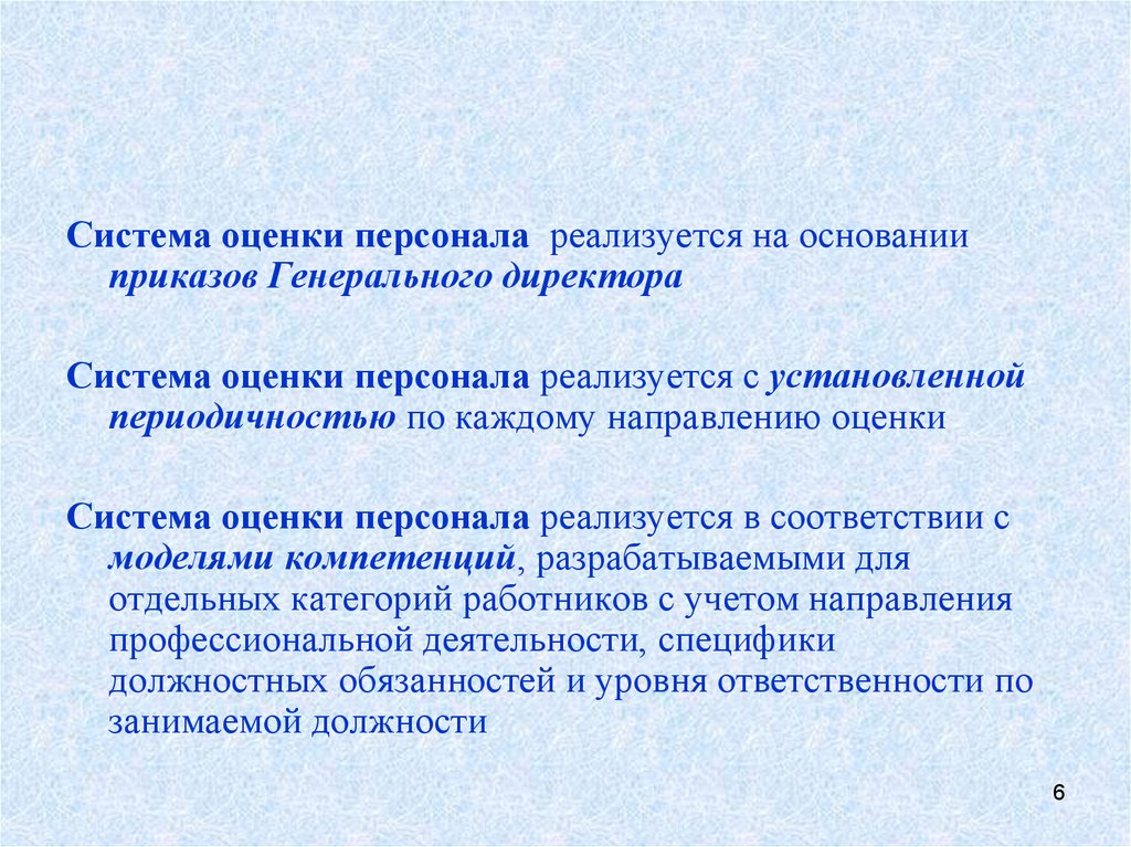Система оценки персонала реализуется на основанииприказов Генерального директора